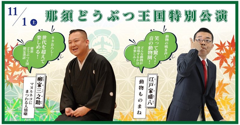 2025年11月1日(土)に「柳家三之助」&「江戸家猫八」特別公演を那須どうぶつ王国で行ないます!
