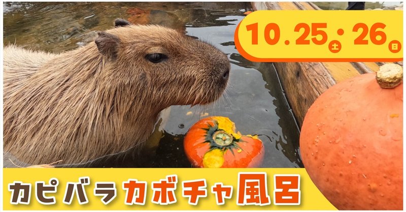 ハロウィンといえばカボチャ。カピバラの露天風呂にカボチャを浮かべます。湯けむりの中にカボチャを浮かべた露天風呂で、カピバラたちがのんびりとくつろぐ姿は、見ているだけで癒されます。季節ならではの可愛らしい光景を、ぜひお楽しみください。