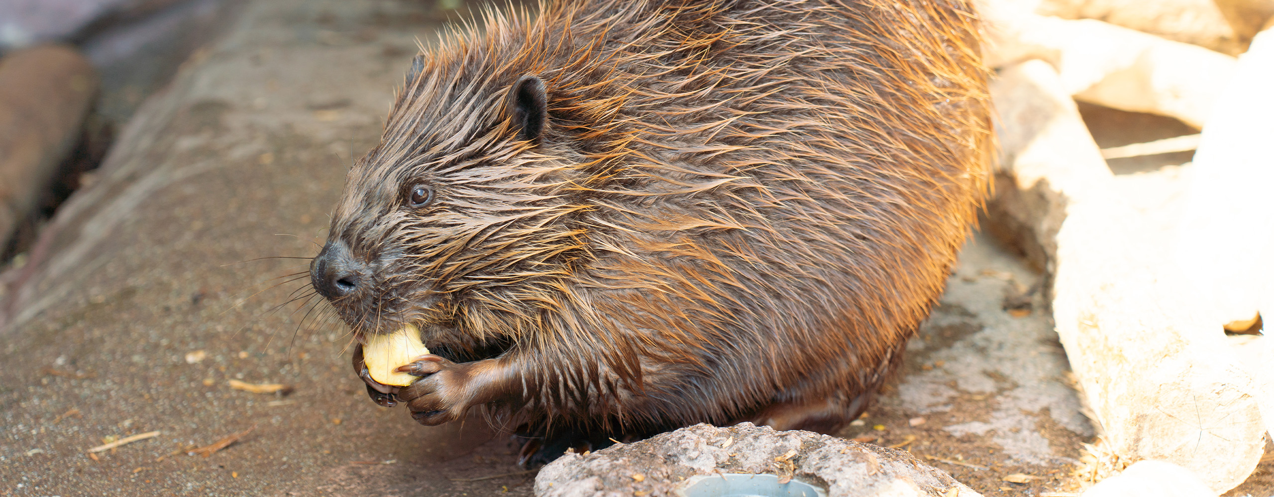 枝をかじり毛づくろいする姿や、ガラス越しには泳ぐビーバーたちを