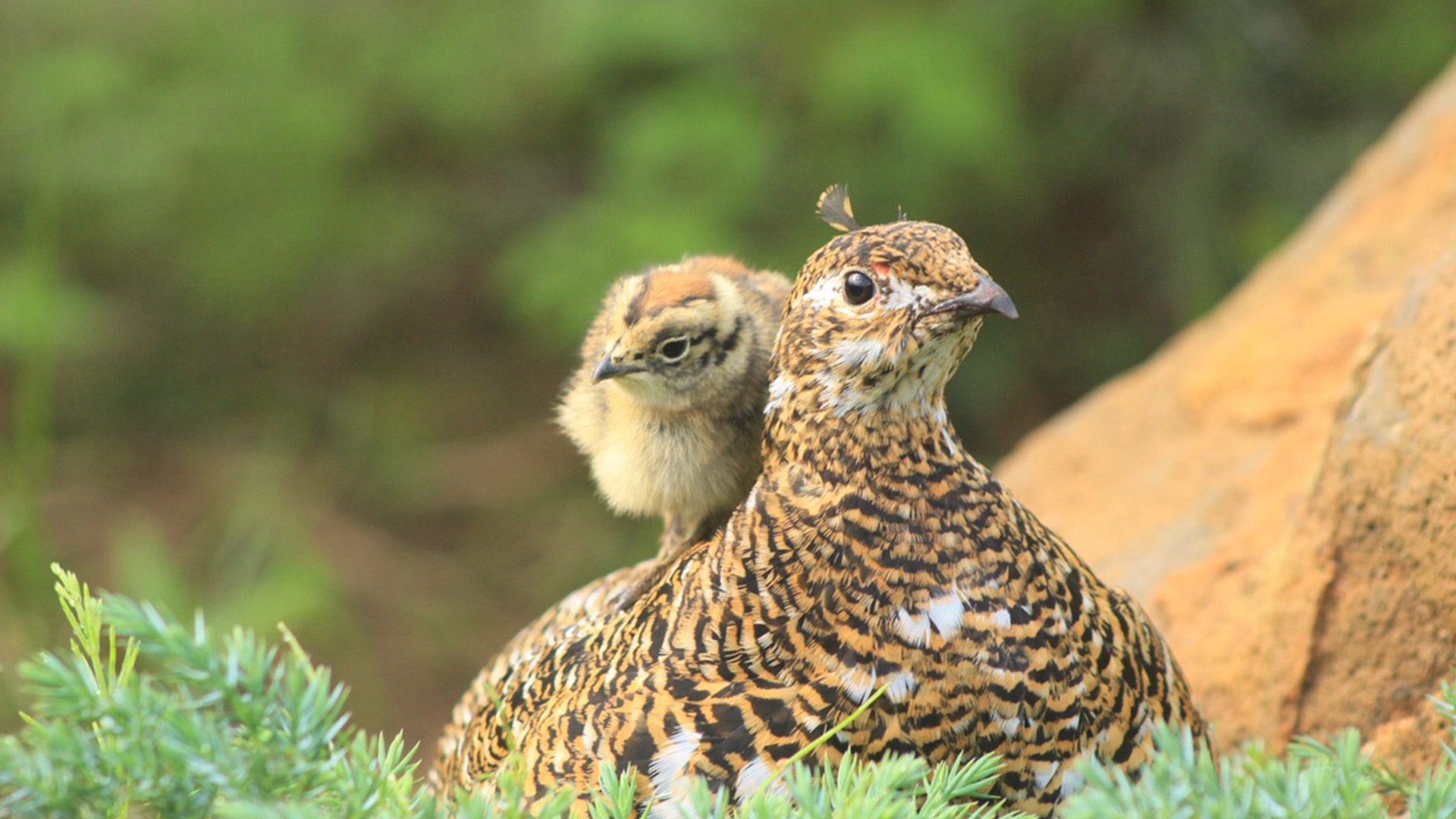 本州中部の標高約2,200〜2,400m以上の高山帯(ハイマツ林帯や岩石帯)に生息する、日本固有の鳥です。国の特別天然記念物に指定され、絶滅危惧ⅠB類として保護されています。1年に3回換羽し、夏羽は白・黒・茶の斑模様、冬羽は尾を除き全身白色になります。繁殖期は6月初旬から中旬で、6〜8個の卵を産み、ヒナは21〜22日で孵化します。