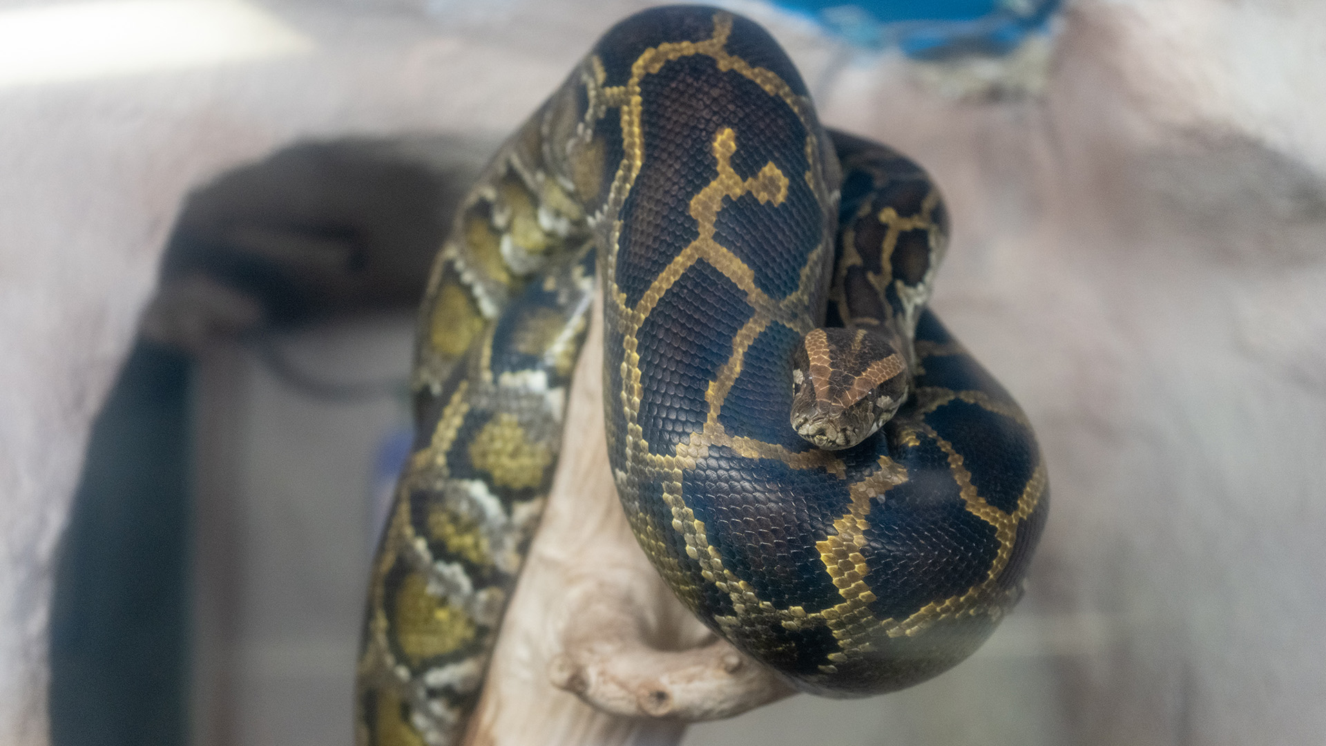 ビルマニシキヘビは、体の網目模様が生息地での保護色となっています。泳ぎが得意で、潜水能力にも優れ、30分ほど水中で過ごすこともできます。樹上にもよく登りますが、大きな個体は地上で過ごすことが多くなります。那須どうぶつ王国の「熱帯の森」では、ビルマニシキヘビの特徴的な模様や体の大きさを間近で見ることができます。