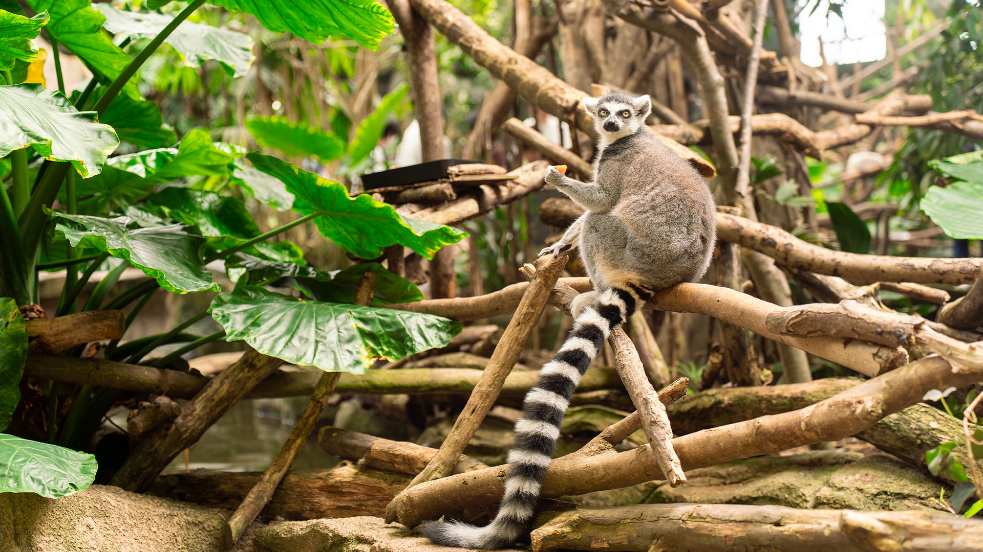 マダガスカル島と周辺の島にしか分布していない固有種です。尾は体長よりも長く、名前の由来でもある尾の黒と白の輪の模様が特徴です。群れで暮らし、社会性が強い生活をおくり、群れの中での雌の方が雄より優位な母系集団を形成します。昼行性で樹上生活をしていますが、地上に降りて移動もします。代謝が低く、気温が低いときには日光浴をして体を温めます。前足の手首には臭いを出す特殊な分泌腺があり、この分泌液を樹木や尾にこすり付けます。これは、尾を再び木の枝などにこすり付けてマーキングし、縄張りを示すためであると考えられています。那須どうぶつ王国の「ウェットランド」では、ワオキツネザルの尾の模様や樹上での様子を間近で観察できます。また、ワオワオトークでは、飼育スタッフによる解説を聞きながらワオキツネザルの生態や習性について学ぶこともできます。