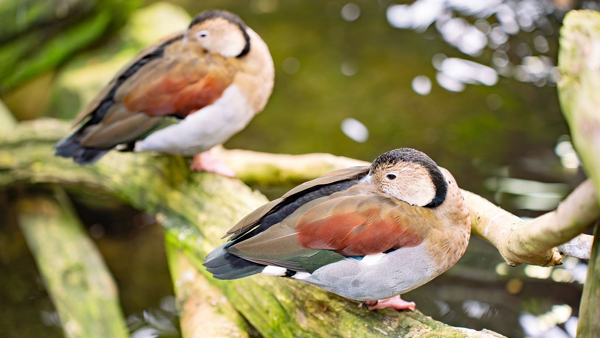 熱帯雨林に生息するクビワコガモは、オスの首に首輪のような模様があるのが特徴で、世界でも最小級のカモのひとつです。先の尖った爪を使って木の枝に止まることもでき、かわいらしい姿で枝の上を移動します。水草や種子、昆虫などを食べて生活しています。那須どうぶつ王国では、給餌体験を通してエサを食べる様子や、枝に止まる愛らしい姿を間近で観察できます。小さな体ながら鮮やかな模様と活動的な行動が見どころです。