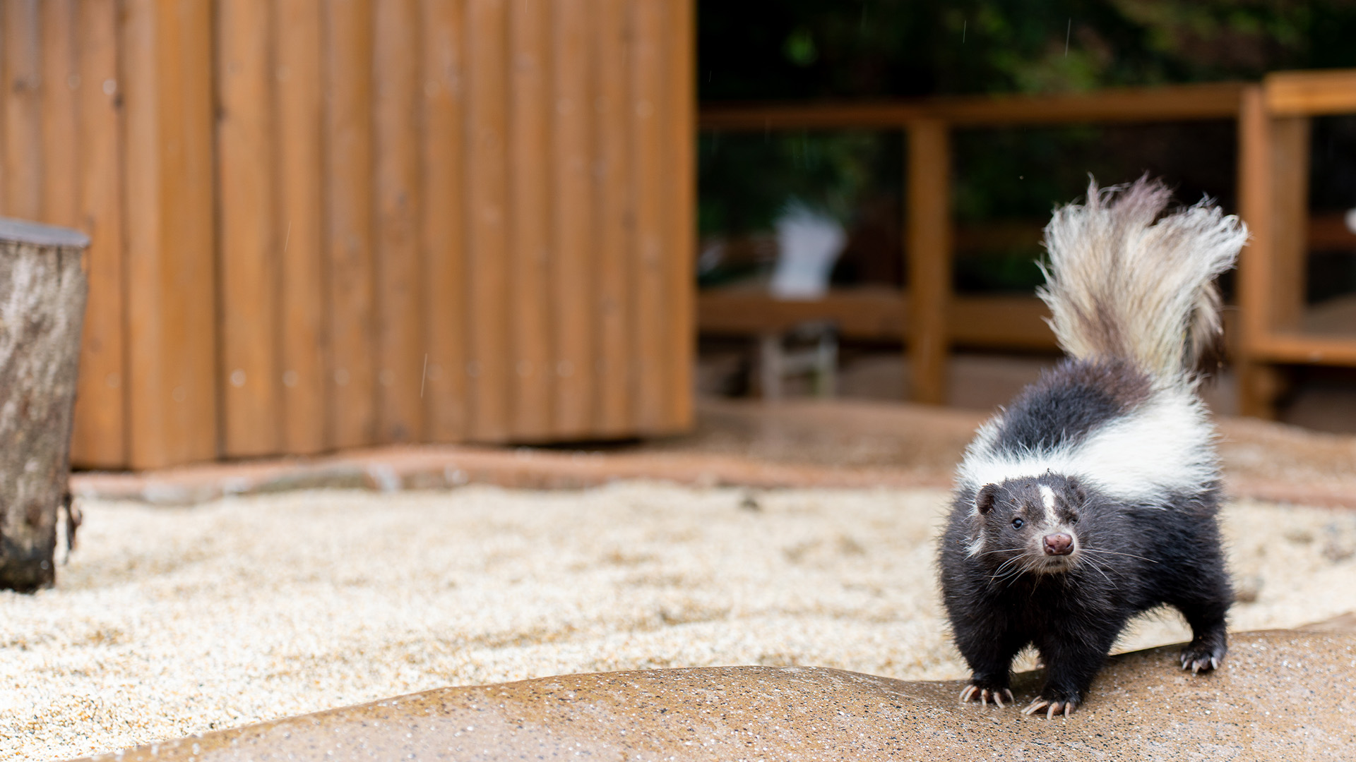 頭のてっぺんから尾にかけて、背中に白い縦じまが入るのが特徴です。危険を感じると、肛門近くにある臭腺から強いにおいの液体を出して身を守ります。そのにおいは風に乗って半径約1キロ先まで届くともいわれ、外敵にとっては強力な防御手段となります。液体が目に入ると、一時的に見えにくくなることもあります。那須どうぶつ王国では、穏やかに過ごす姿をご覧いただけます。