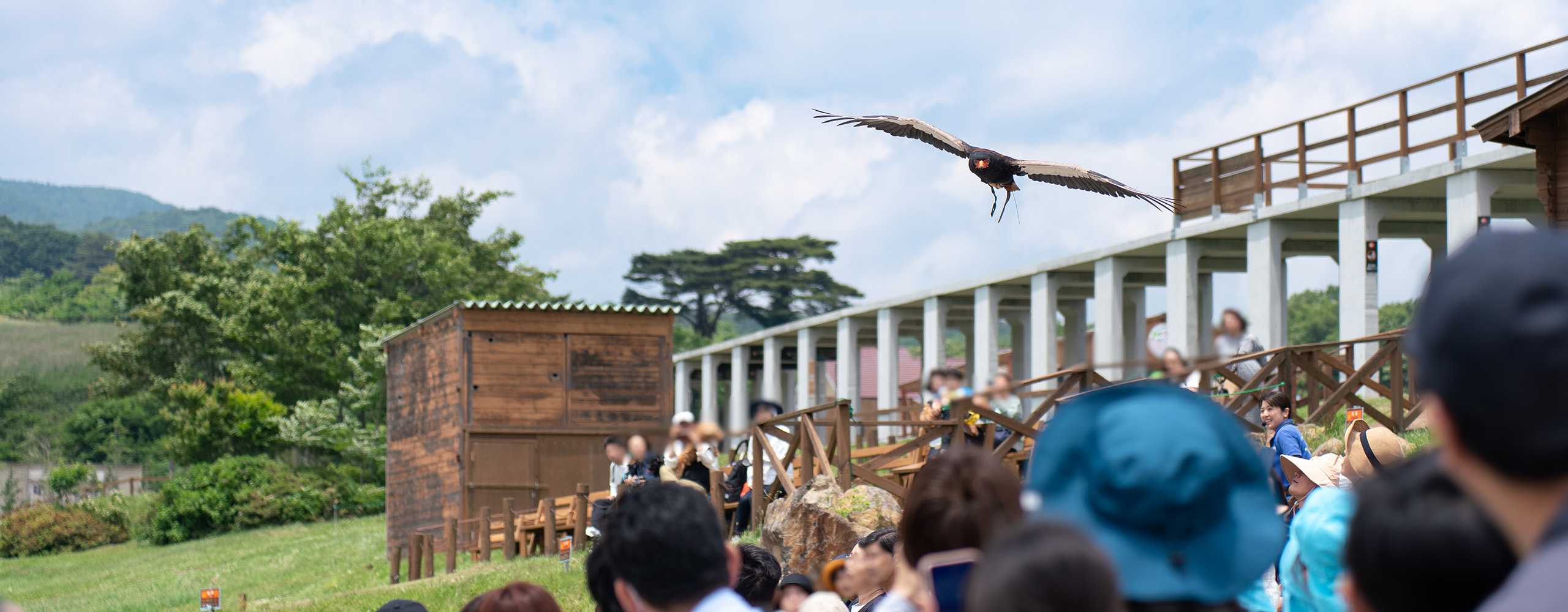 那須の広大な自然と空を舞台に猛禽類たちが迫力満点のフライトパフォーマンスをお楽しみいただける野外施設です。