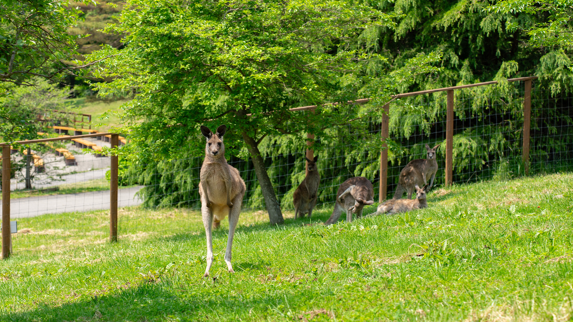 平原の森やウッドランドに生息し、2〜10頭の群れで生活する大型のカンガルーです。メスは前方に開口する育児嚢を持ち、乳頭は4つあります。昼間は林内で休み、夕暮れから夜にかけて草原へ出て採食します。後ろ足は頑丈で筋肉が発達しており、最高時速は70km、ジャンプは5〜7mに達します。太くて長い尾は体を支えたり、走るときのバランスをとるのに役立ちます。那須どうぶつ王国では、「カンガルーファーム」で、ハイイロカンガルーの力強い跳躍や群れでの様子を観察できます。