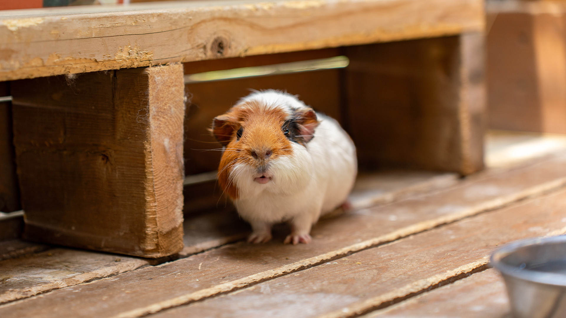温和な性格で飼いやすく、愛玩用としても人気です。尾はなく、前肢4本・後肢5本の指を持ち、歯は一生伸び続けます。基本的には夜行性で、高温多湿に弱いですが、繁殖力が高く、短毛種と長毛種があり、品種は10種近く存在します。鳴き声で仲間とコミュニケーションを取っています。那須どうぶつ王国の「ふれあいうさぎ広場」では、モルモットと直接ふれあうことができます。