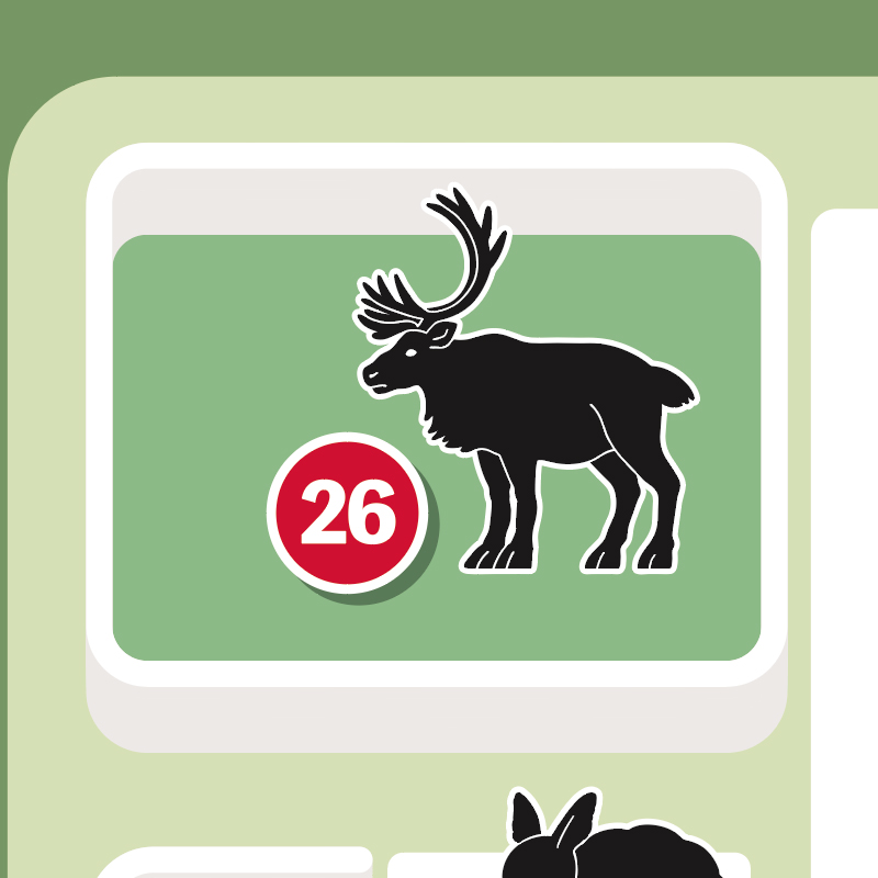 寒さに強く、気温-50℃まで耐えられるシカ科の動物です。蹄は4本で平たく大きく、雪の上でも滑りにくく、埋まりにくい構造になっています。シカ科で唯一、雌雄ともに角を持ち、左右非対称で毎年生え変わります。角は成長段階で表皮と毛に覆われた『袋角』から始まり、やがて表皮がはがれて『枝角』となります。