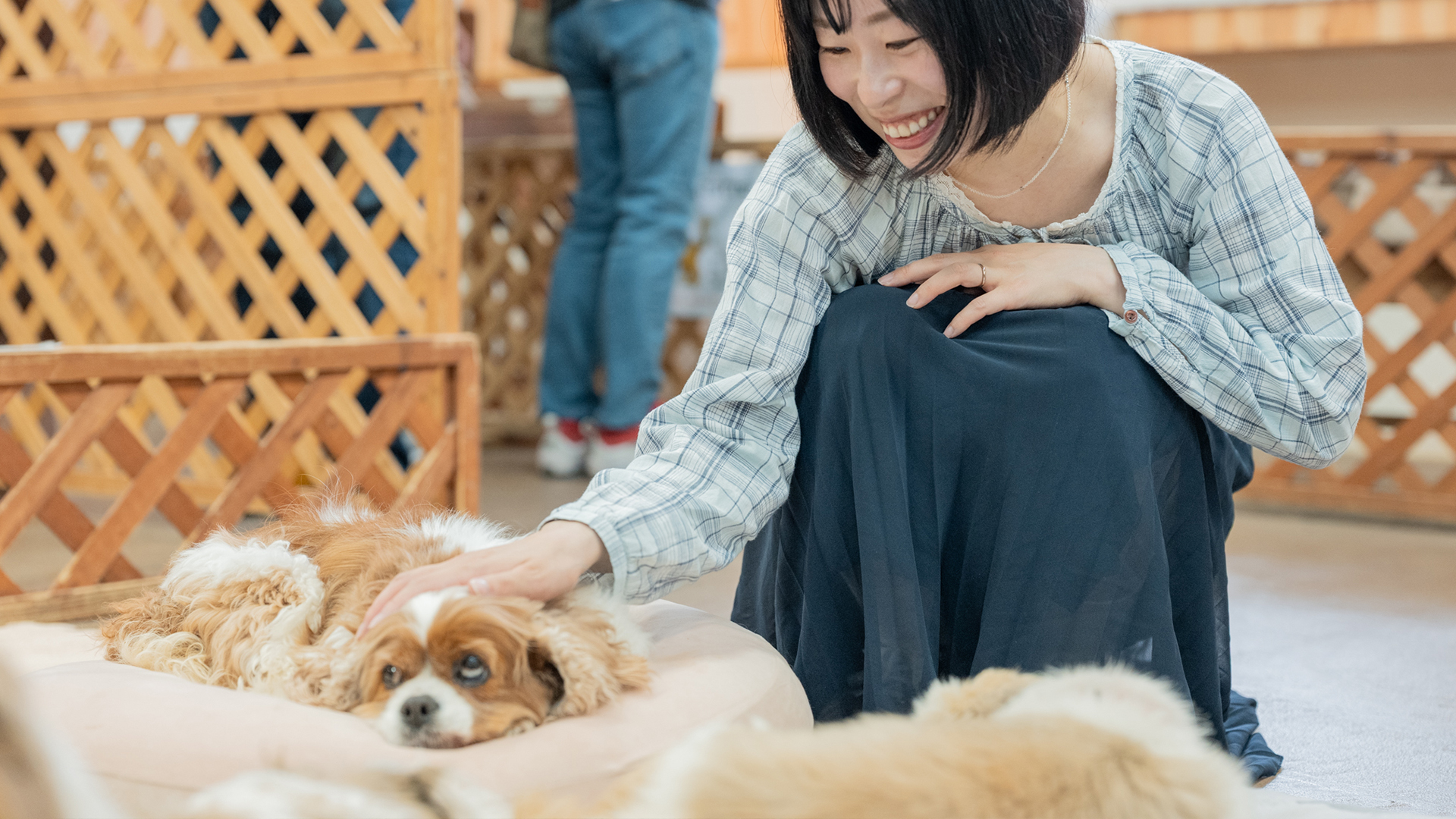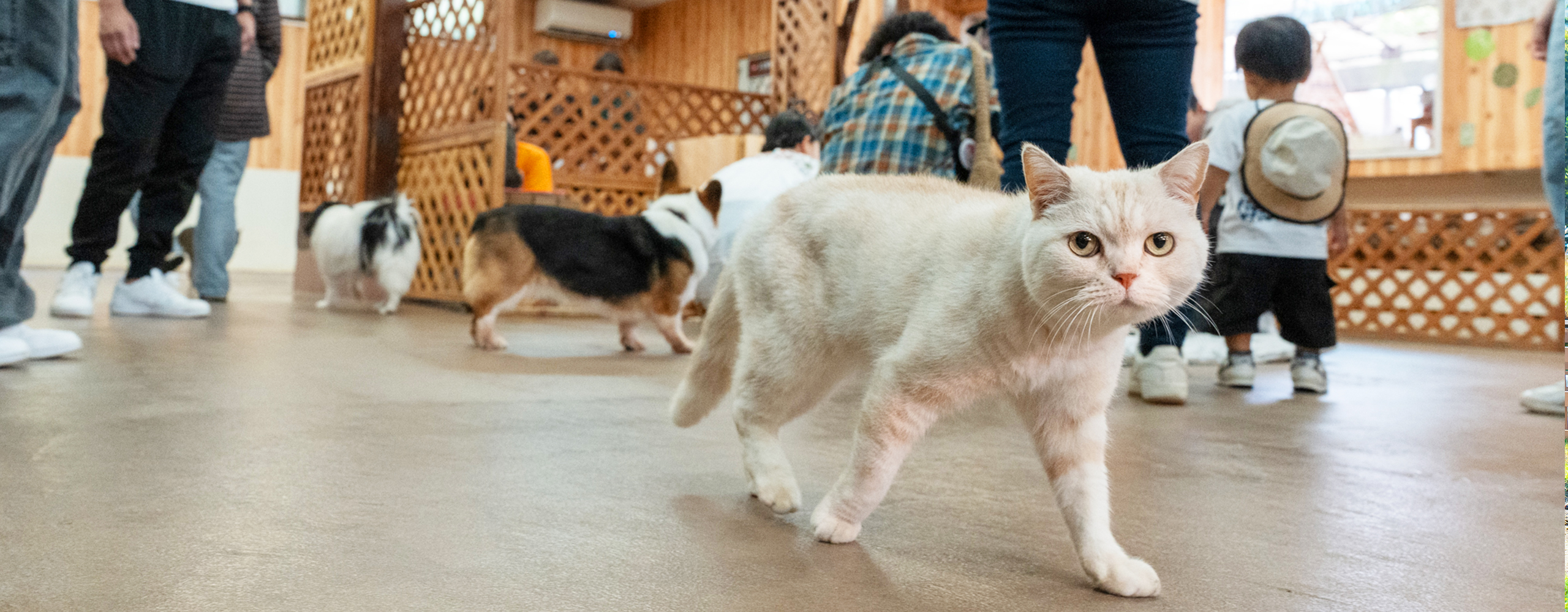 様々な種類の小型犬と猫たちが仲良く暮らす、ふれあいエリアです。
