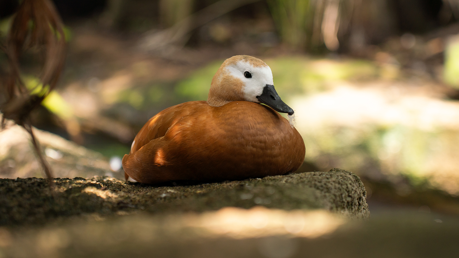 全身が明るいオレンジ色で、首から上はやや淡い色合いの大型カモ、アカツクシガモ。繁殖期のオスは首にくっきりと黒い“首輪”が現れ、メスはくちばしと目の周りが白っぽいのが特徴です。ユーラシア大陸中部で繁殖し、冬はアフリカ北部や南ユーラシア、中国、朝鮮半島などへ南下します。日本には冬鳥としてまれにやってきます。浅い水辺でエサを探して食べるほか、警戒や争いのときには翼を半開きにして体を大きく見せ、尾羽を広げ、首を伸ばして鳴きます。求愛は陸上で行われ、メスの働きかけにオスが頭を上げて後ろへ振り、尾羽を上げて大きな声で応えます。