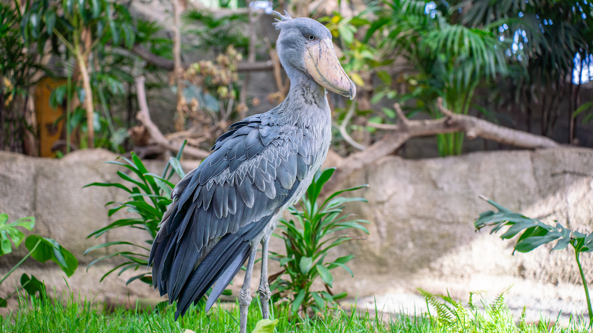 那須どうぶつ王国の「ウェットランド」では、ハシビロコウの大きなくちばしや堂々とした姿を見ることができます。