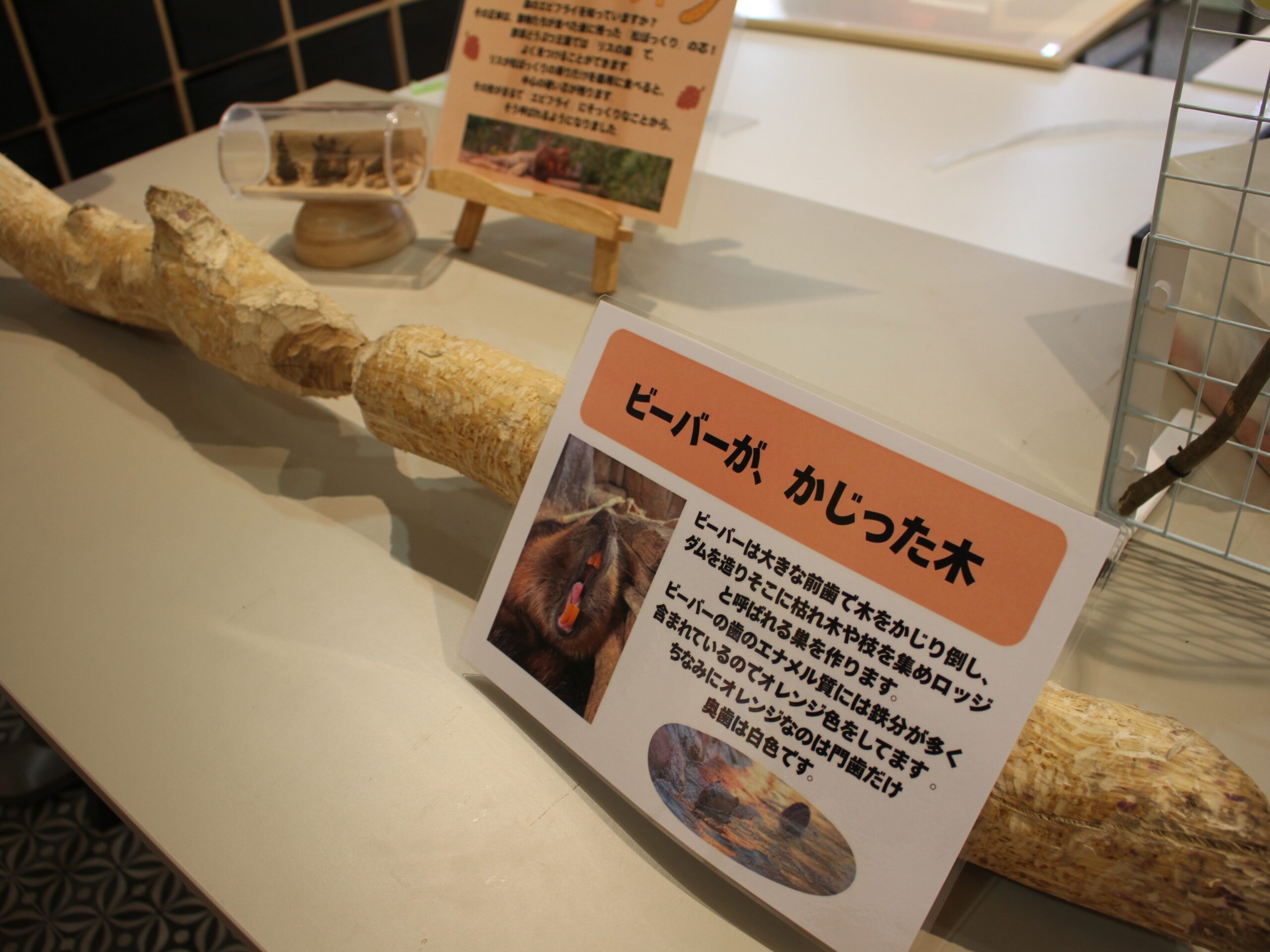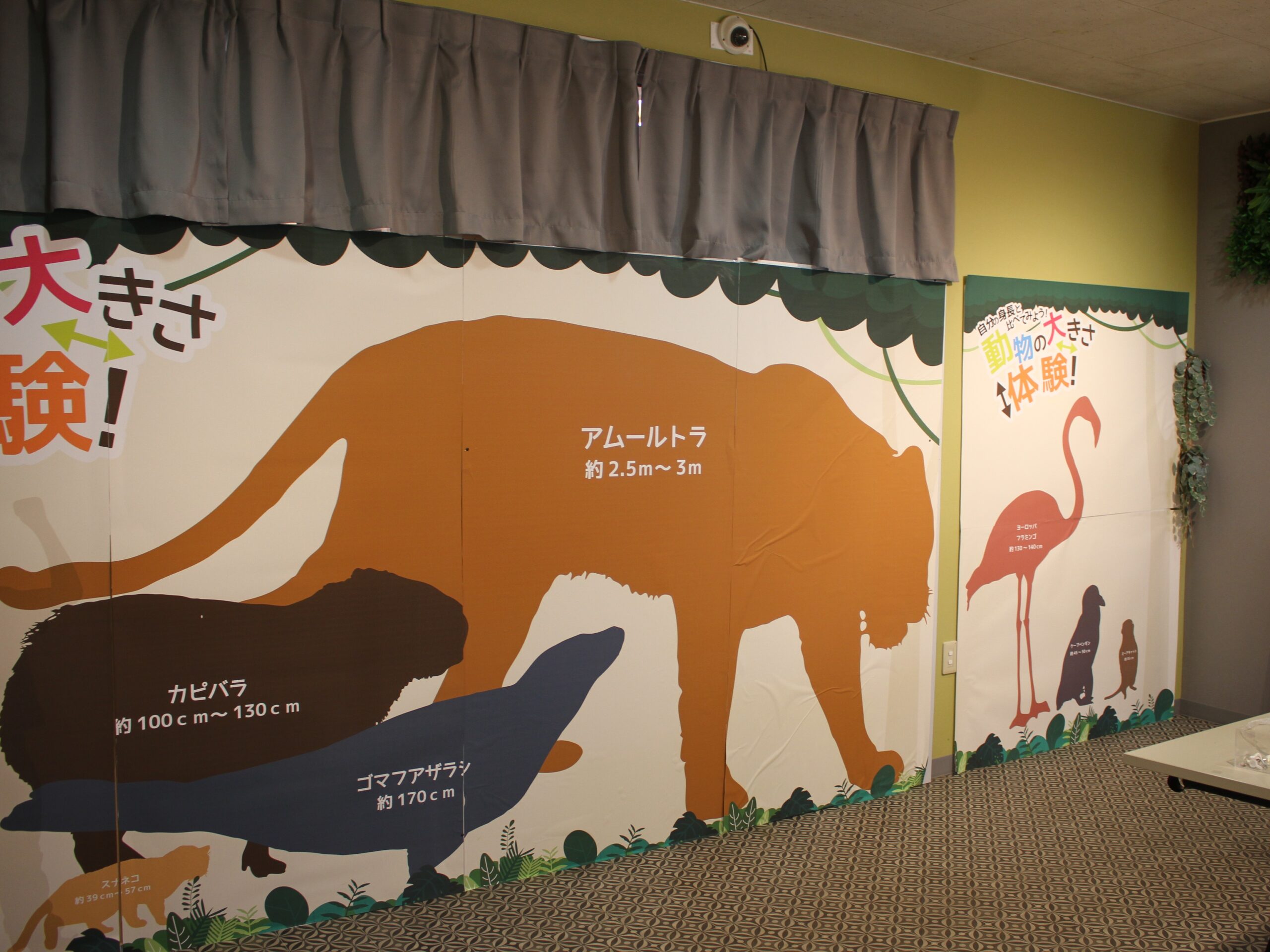 - 「人間と動物の違い」パネル展示の大きさ比べ。デジタルスコープを利用した毛や爪、骨を使った観察、講話