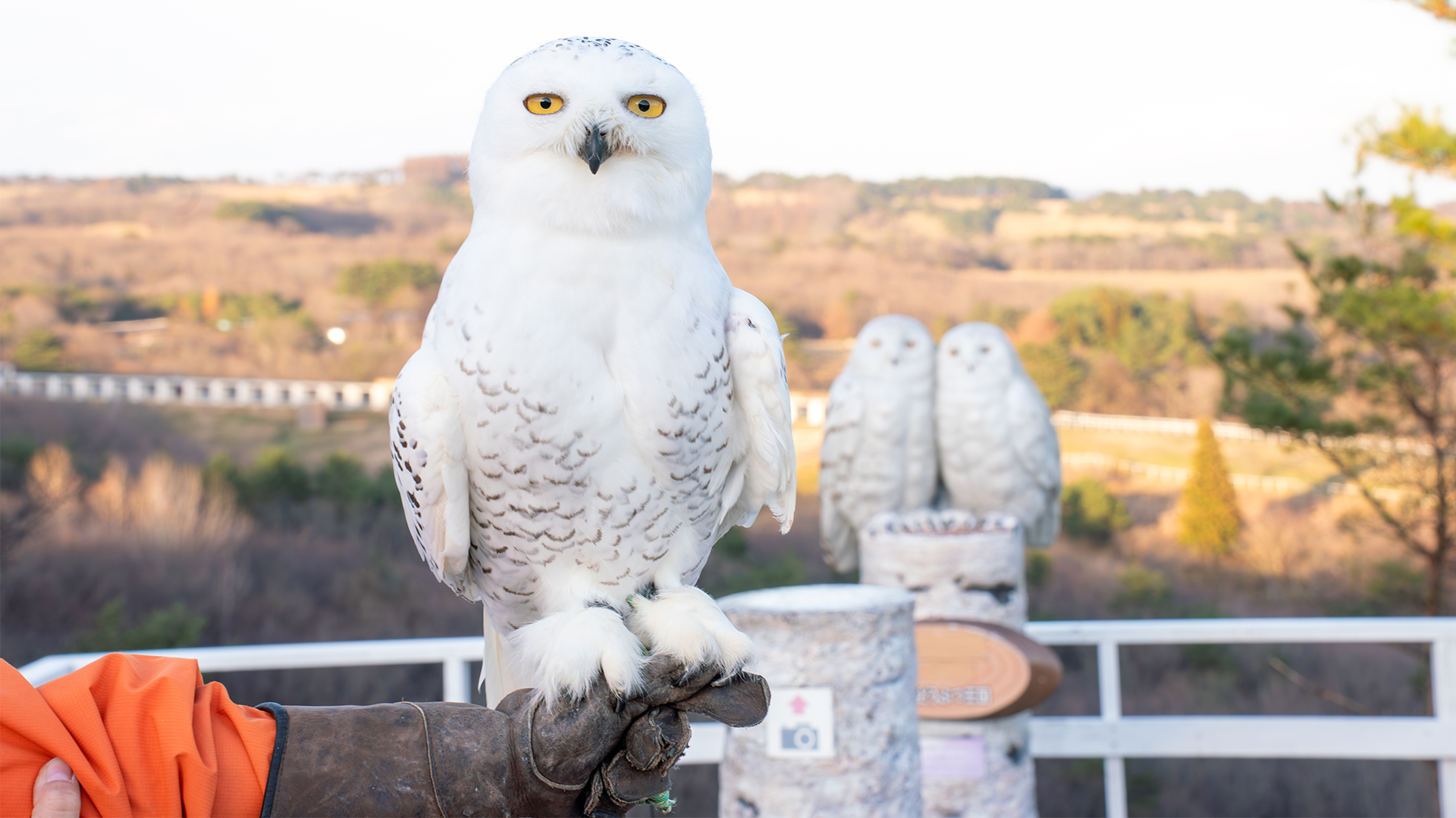 オスは成熟すると全身が白くなり、メスは暗褐色の縞模様があるのが特徴です。北極圏などの寒冷な地域に生息しており、白夜と呼ばれる太陽の沈まない季節があるため、フクロウの中では珍しく昼間に活動します。冬になると南へ移動することがあり、日本では北海道で見られることもあります。那須どうぶつ王国の「猛禽の森」では、シロフクロウの美しい白い羽や堂々とした姿を見ることができます。