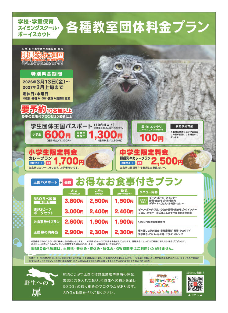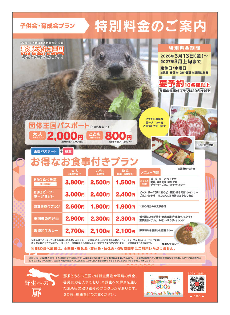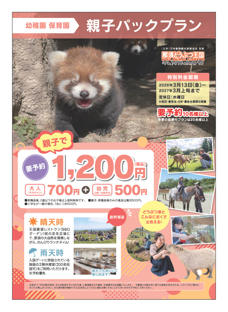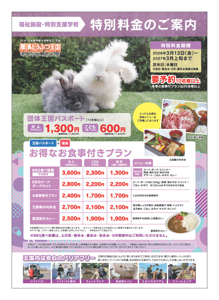 動物施設の見学、パフォーマンスの観覧、わんにゃんバス乗車、入国料が全てセット料金になって1日楽しむことができます。
