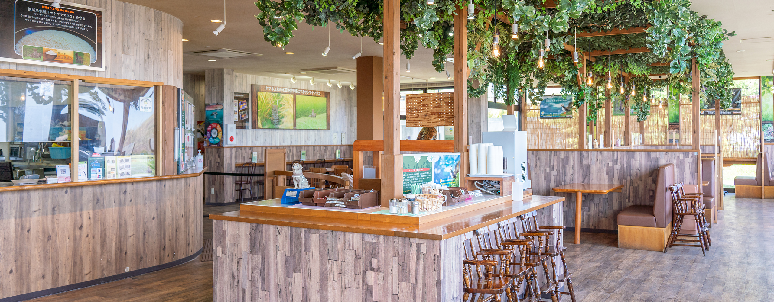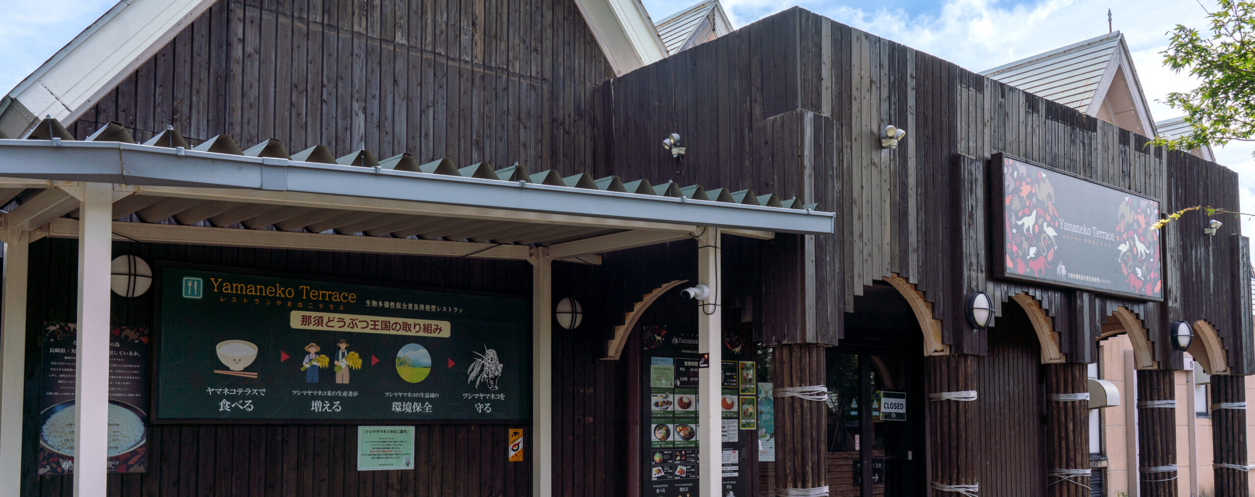 目の前に広がる那須の自然と共に食事が楽しめる展望抜群のレストラン「ヤマネコテラス」は、生物多様性について興味を持っていただくことを目的とした普及啓発型レストランでもあります。