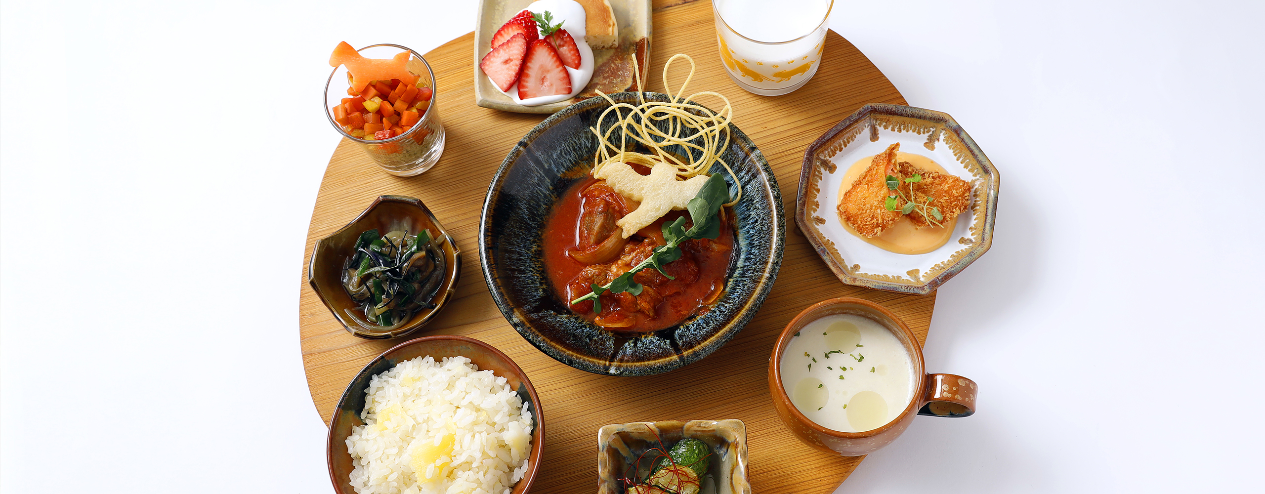 那須の素材を使用した特別なメニュー ・那須和牛 トマト煮込み ・バジルクスクスのスプーンサラダ ・長葱と玉葱のポタージュ ・茄子とニラのレモンオイルマリネ ・キャッサバの洋風炊き込みご飯 ・ズッキーニのエスカベッシュ ・ヤシオマスフライ ・季節のフルーツ パンケーキ ・那須の牛乳
