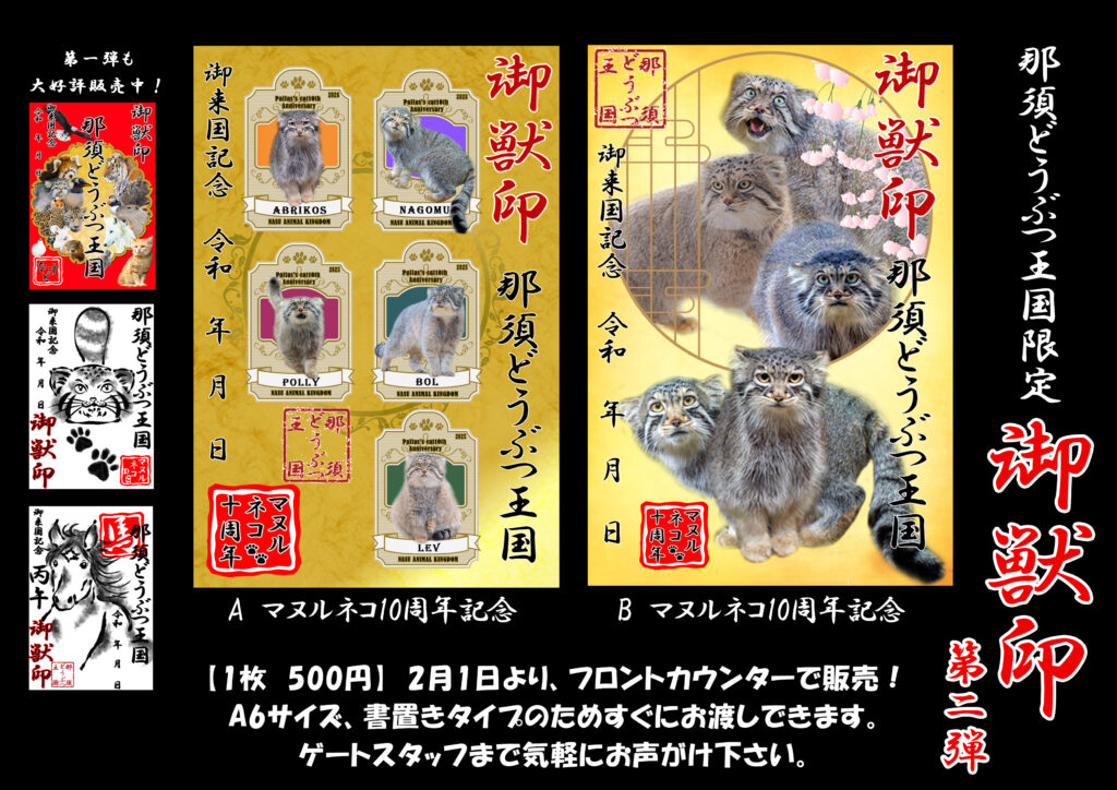 2月1日よりマヌルネコ来園10周年記念デザインの御獣印が2種類で発売!美しい和紙に印刷した書置きタイプの販売なので、すぐにお渡しできます!
