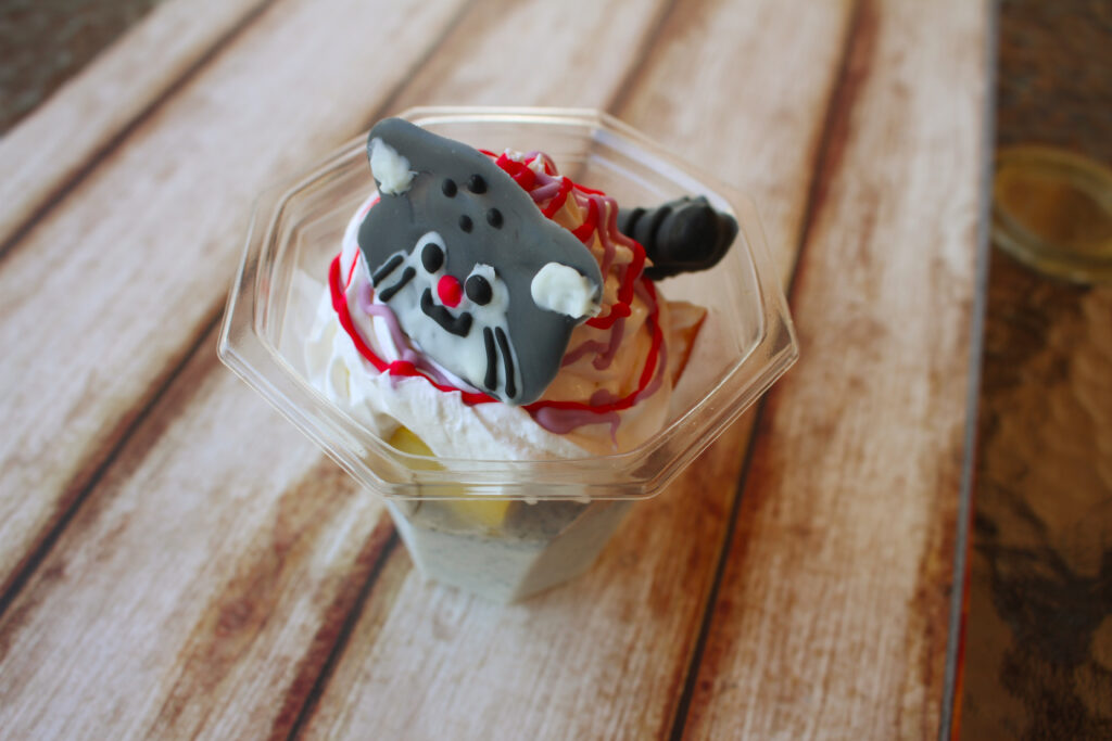 黒ゴマプリンにお芋がのったミニパフェです。赤と紫のデコレーションにマヌルネコのチョコが乗った、ハロウィン仕様のデザート登場です!10月2日(木)から10月31日(金)の期間中、カフェマヌルヌマで販売します。