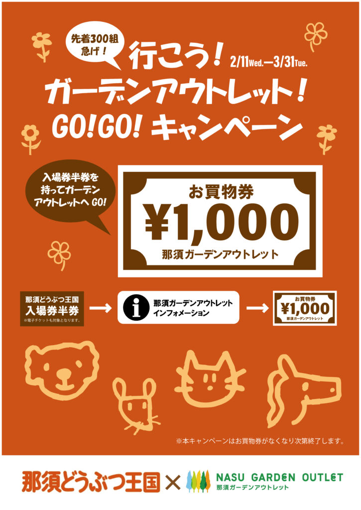 テーマ:企画那須どうぶつ王国の入場券半券(電子チケットも対象)を持ってアウトレットに行くと那須ガーデンアウトレットのインフォメーションセンターにてお買物券1,000円プレゼント!